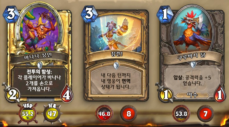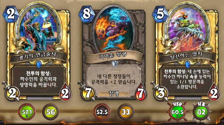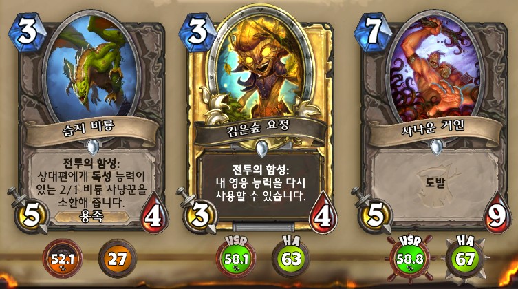 30. 마녀숲 친구들. 요정과 거인이 좋습니다. 6코 이상 카드는 집게, 파라오의 축복, 헌신적인 친구, 황무지 전갈, 은장검이 있습니다. 6, 6, 7, 7, 8코스트. 거인이 황무지 전갈보다 좋지만, 7코 하수인을 더 집고 싶지도 않네요. 검은숲 요정은 좋은 카드기도 하고. 검은숲 요정 선택