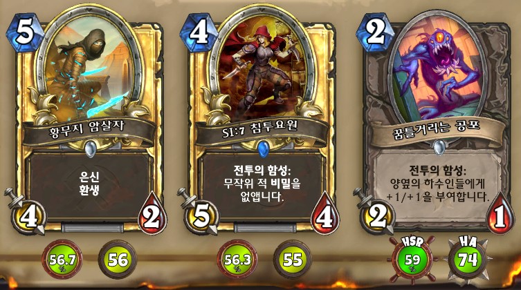 18. 호랑이와 거머리. 둘 다 야수입니다. 1코 하수인은 여명회 파수병, 꿈틀거리는 공포 시너지가 있고, 호랑이는 5마나에 내기 좋고, 파라오의 축복 시너지가 있습니다. 호랑이가 더 마음에 듭니다. 5코 하수인 1호. 가시덤불 호랑이 선택