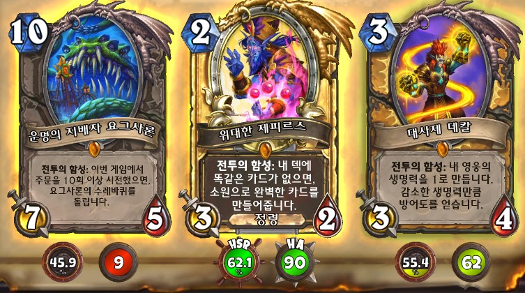 2. 이번엔 좋은 기사 카드가 나왔습니다. 심판은 기사 비밀 중 가장 좋고, 비밀, 신성 시너지도 기대할 수 있습니다. 융합체도 좋은 도발 하수인이고, 용족 시너지를 기대할 수 있습니다. 그 덱에서 용족 뽑는 멀록이요. 4/5 도발 집었습니다. 서커스 융합체 선택