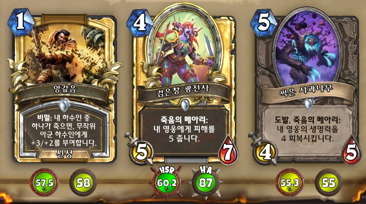 19. 신성 주문은 정의의 심판, 북돋우는 설교, 파라오의 축복이 있습니다. 구세의 기사는 1마나에 낼 수 있고, 우리 덱에서 집을 만한 카드입니다. 전투마도 속공이라 가지고 싶은 카드입니다. 파라오의 축복, 은장검을 노리면 이런 5코 하수인이 있는 건 좋습니다. 구세의 기사는 비밀 시너지와 충돌할 우려도 있고, 속공은 좋습니다. 유령 전투마 선택