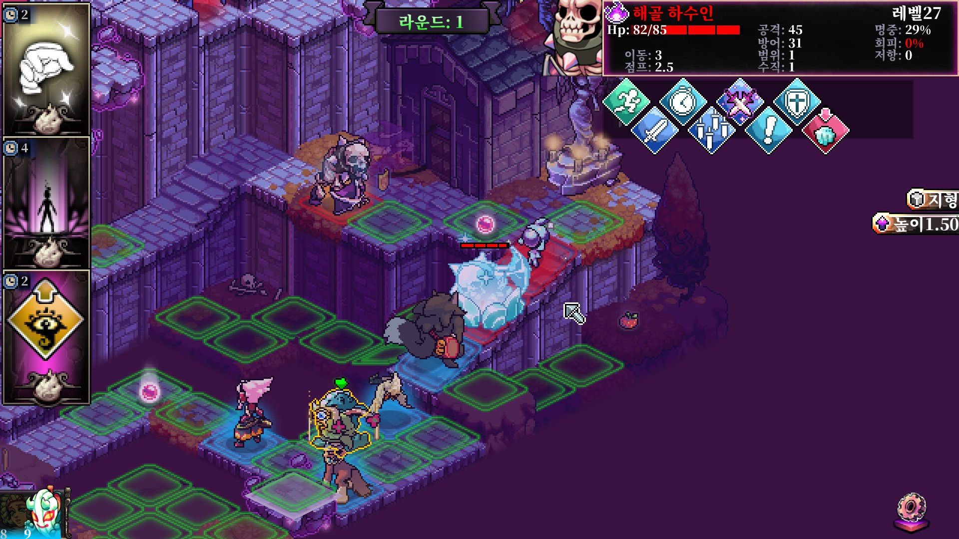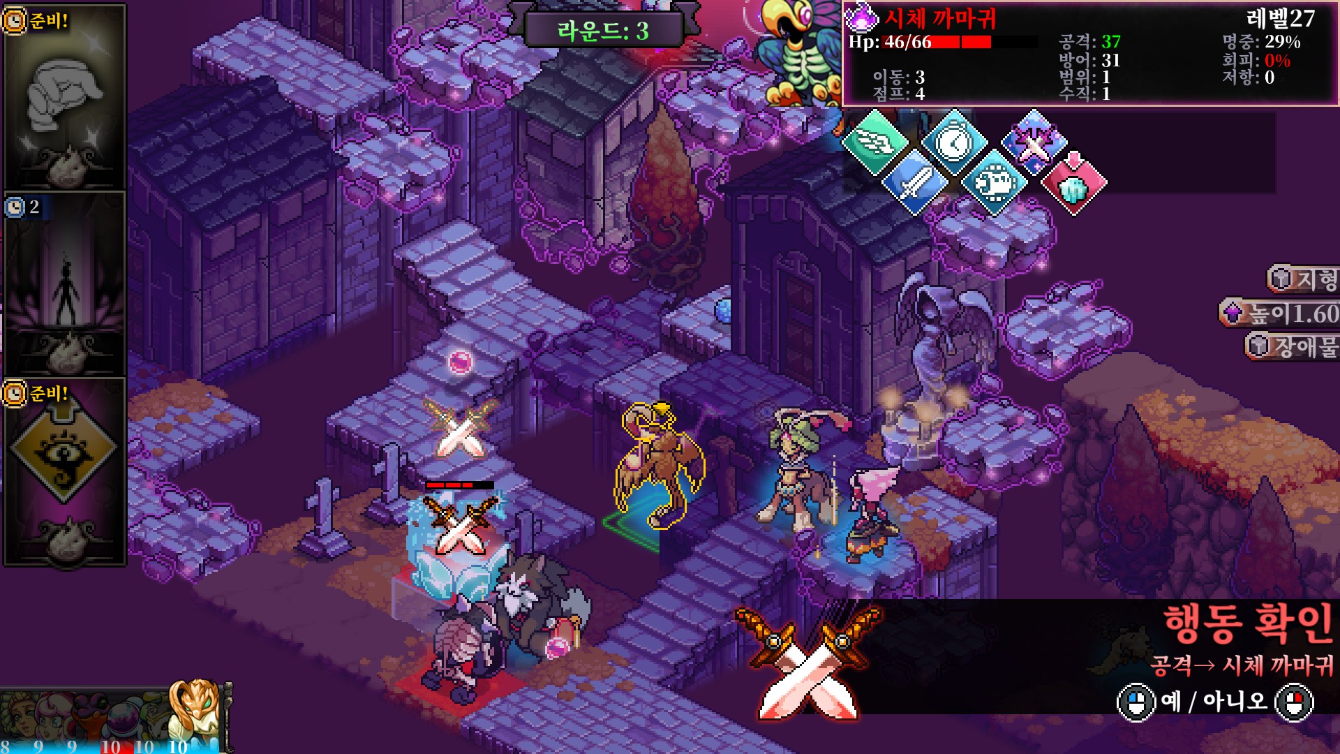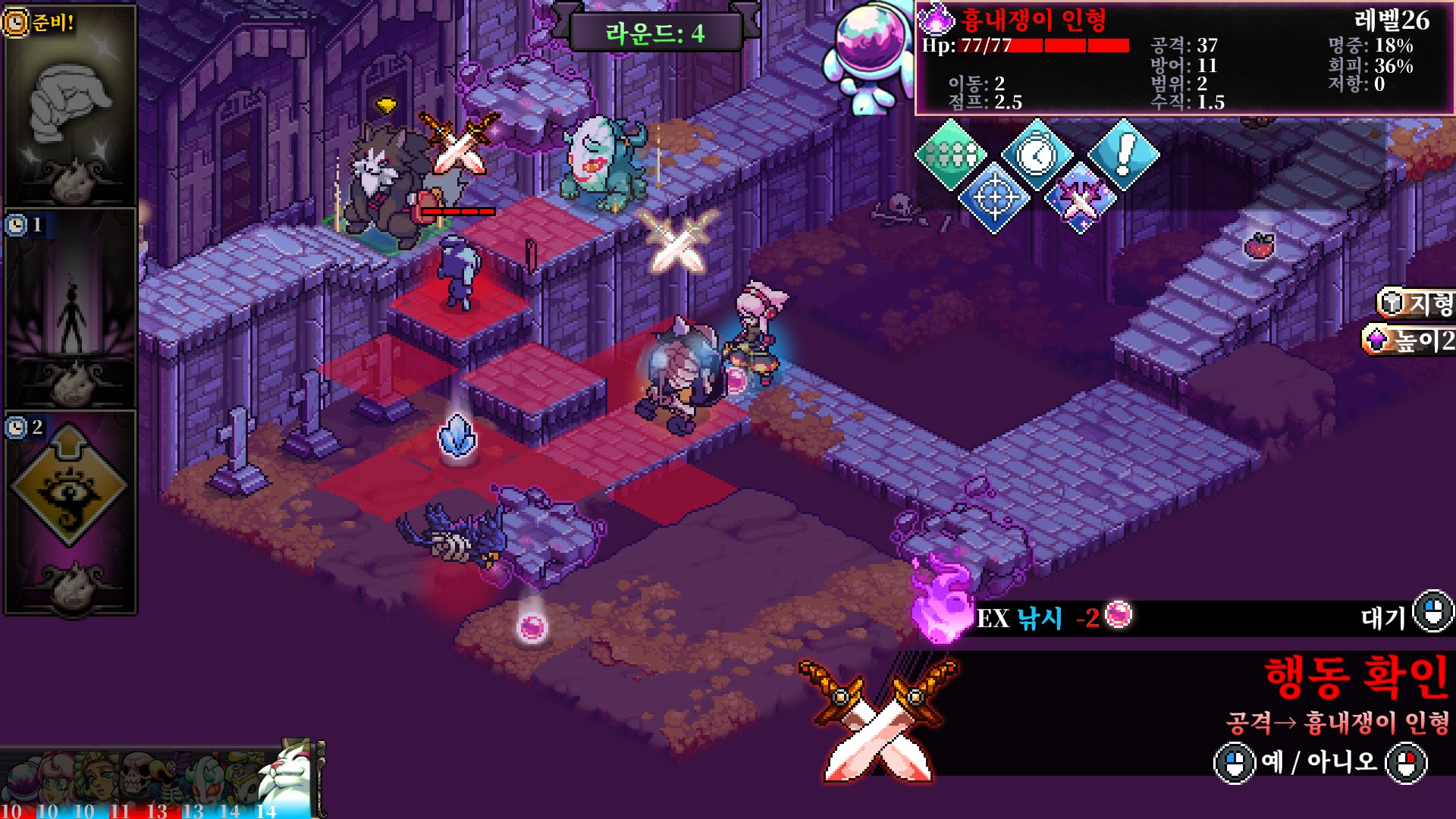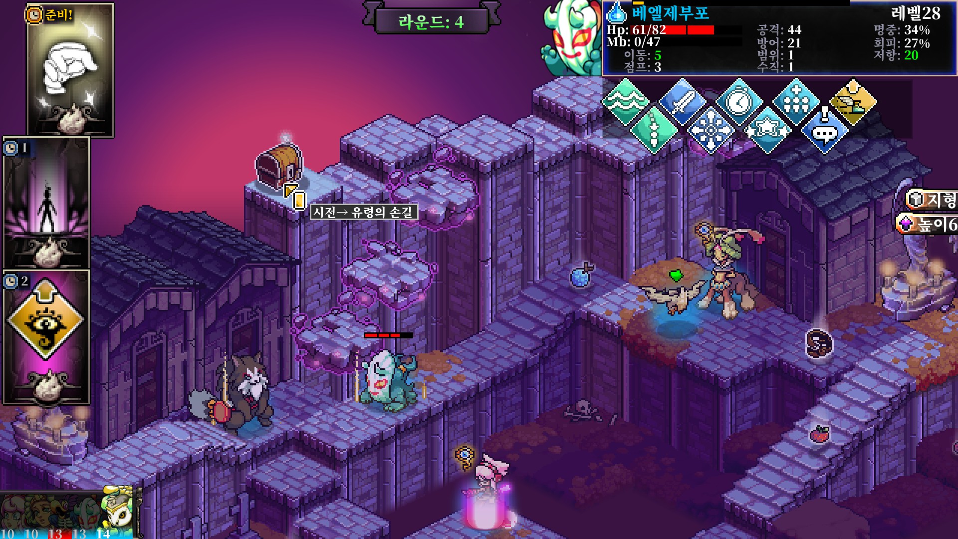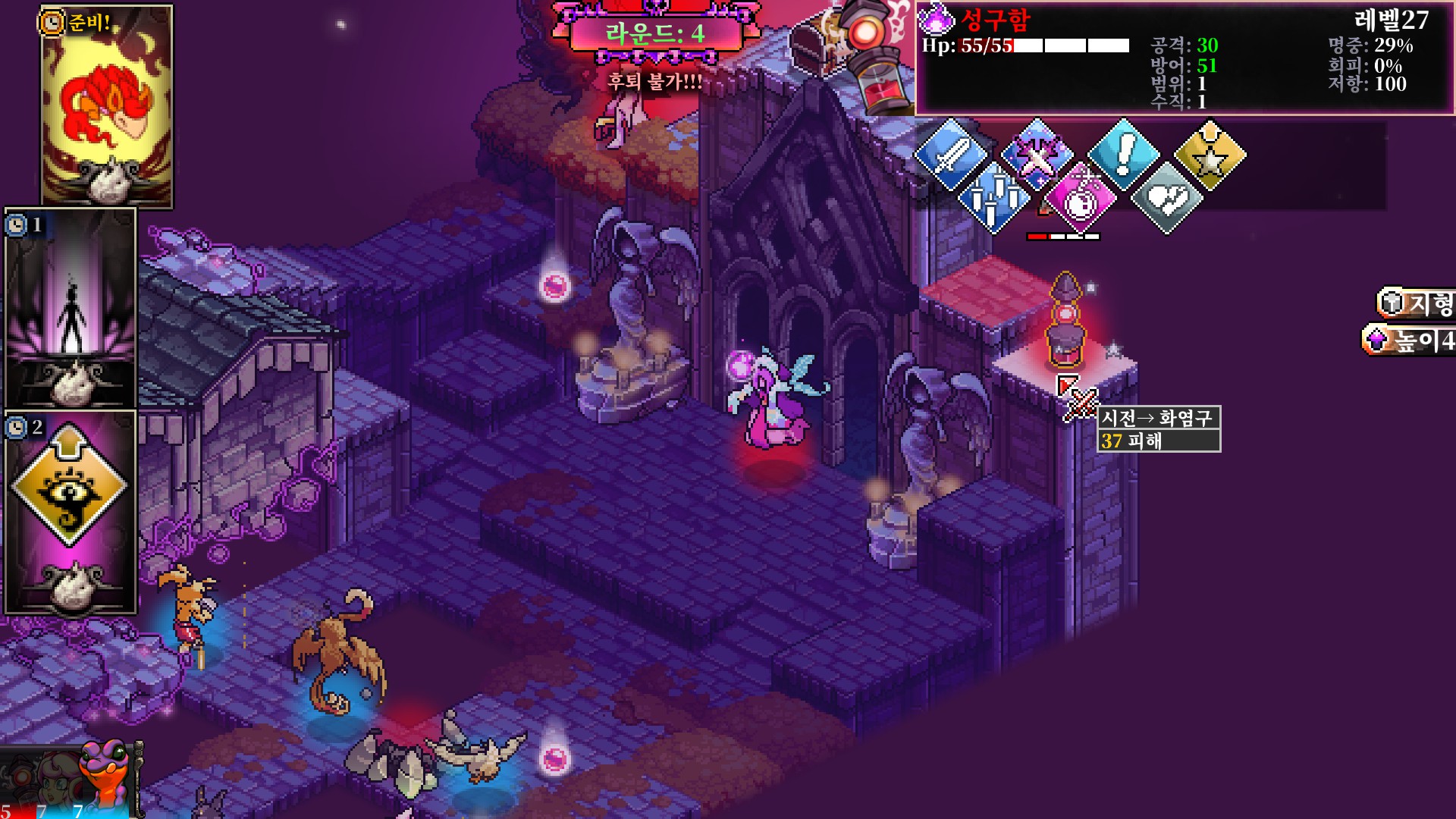 4라운드에는 공격 주문으로 성구함을 때려둡니다. 피촌과 피오니 같은 주요 캐릭터도 전진해서 자리를 잡습니다.