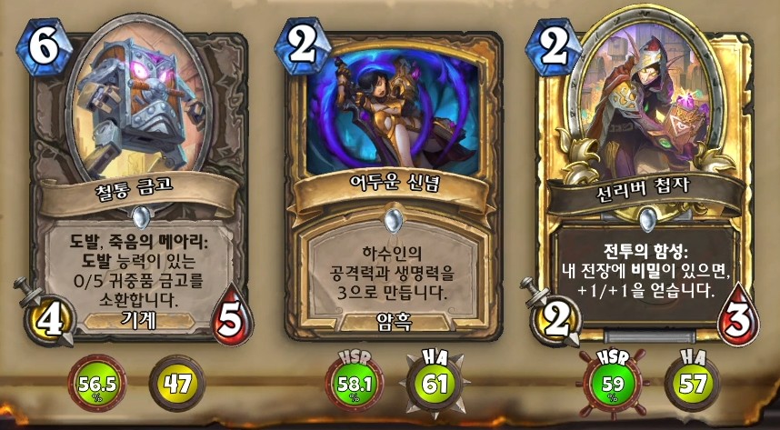 1. 독사와 밴시가 나왔습니다. 독사는 지난 시즌까지 좋았는데, 지금은 야수라는 약점이 생겼습니다. 미니 세트가 나오면서 스톰윈드는 야수 잡는 확장팩이 되어버렸어요. 그런데 어쩌다 1패 하더라도 집을 수밖에 없는 게 야수입니다. 밴시는 얼왕기 카드입니다. 지금은 용의자, 전갈이 있으니 밴시가 가장 좋은 카드는 아닙니다. 3/4 하수인과 비슷한 정도로 좋은 카드입니다. 오랜만에 보는 밴시 집어보겠습니다. 통곡하는 밴시 선택